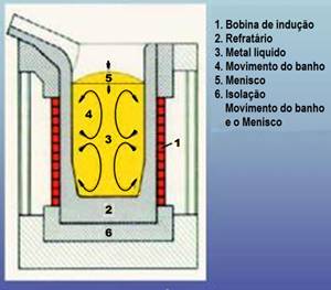 Fig. 4 - O processo de fusão é feito em fornos de indução para garantir uma melhor homogeneização da liga, devido a grande movimentação do banho criado pelo campo magnético gerado.