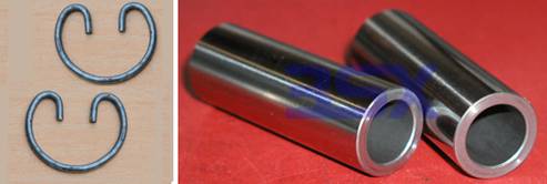 O pino do pistão é construído de aço SAE8620 sofrendo cimentação com profundidade de 0,75 após tempera, e finalmente retificado, ficando com dureza de 64 Hrc. Originalmente tem uma das pontas fechada objetivando o bloqueio da circulação de gás carburado de um lado para outro do pistão que nos parece hoje um erro do projeto original, pois ficando dentro do pino aumenta o calor que poderia estar sendo trocado. Toodavia este particular é tão irrisório que o desprezamos como melhorias possíveis .